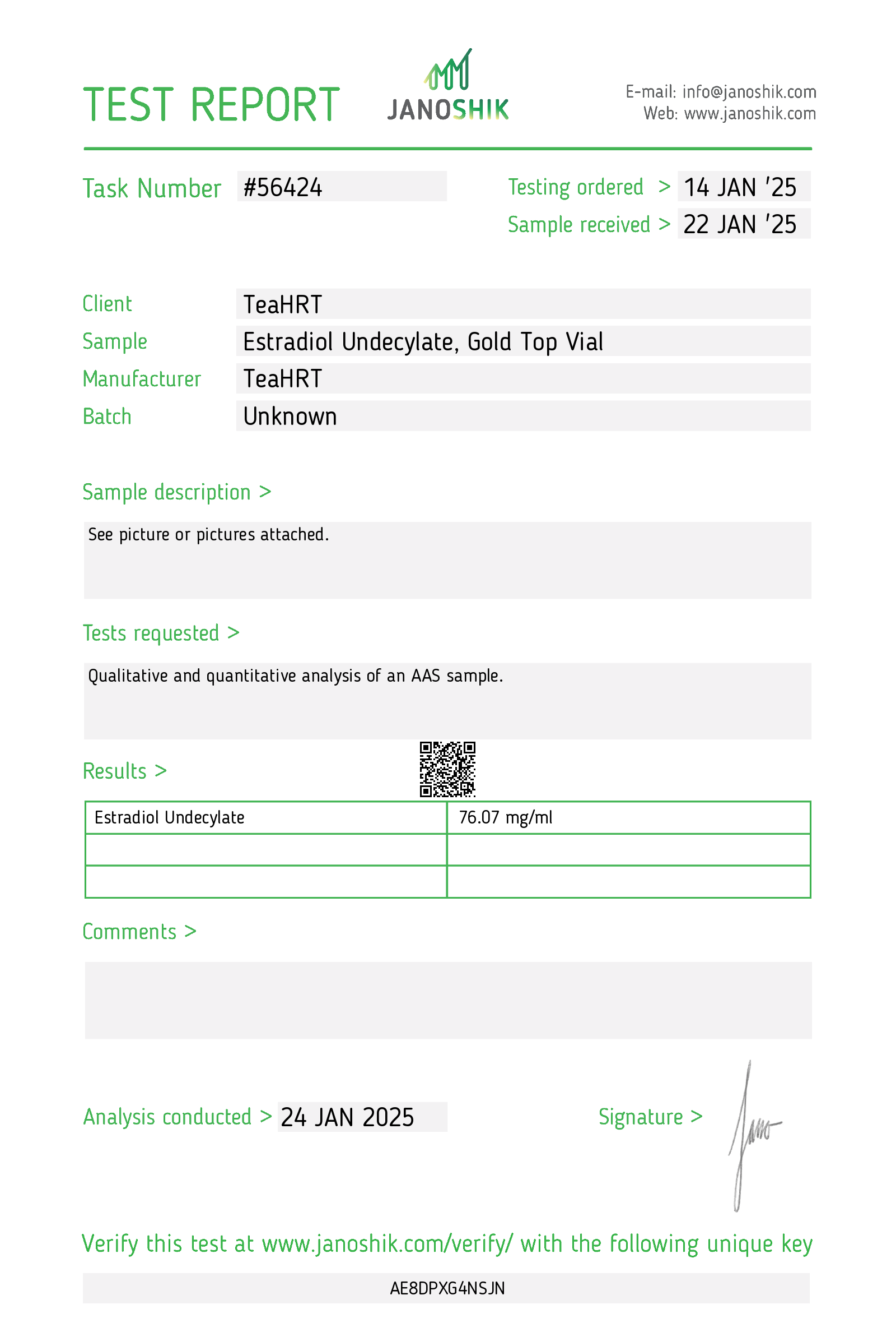 TeaHRT is a collective of individuals operating within the United States, two of whom are trained chemists and/or work in pharmaceutical compounding. They started the website shipping nationwide and are now operating globally. They've been operating since mid 2023 and have slowly gained a positive reputation within the the wider trans community. They perform a high quality filtration process, third party testing and are very open regarding their process.