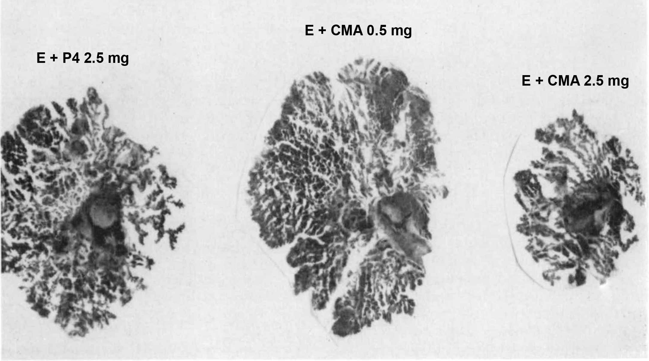 Our observations indicate that CA alone does not exert any clear effect on mammary gland growth. Similarly, P per se lacks stimulatory effects on mammary development in the gonadectomized rabbit (3). On the other hand, when low doses of CA (0.5 mg) were combined with E, maximal ducto-alveolar development occurred. The development of these glands was comparable to that observed in late pregnancy in the rabbit. The fact that the mammary growth obtained with 0.5 mg CA plus E was greater than that found after combination of P and E agrees with the observation that CA is a more potent progestational agent than P (4).