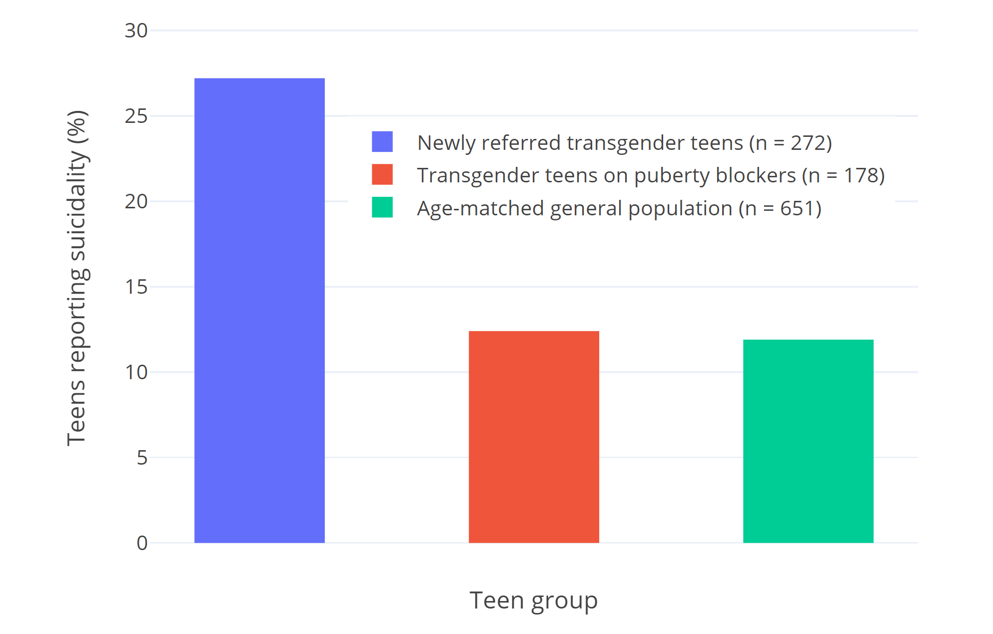 This is not to say that studies evaluating such outcomes don’t exist at all: for example, while not randomised or blinded, Costa et al. (2015) compares 101 patients receiving psychological support and puberty blockers to 100 patients receiving psychological support alone. The results of this study are further outlined below.