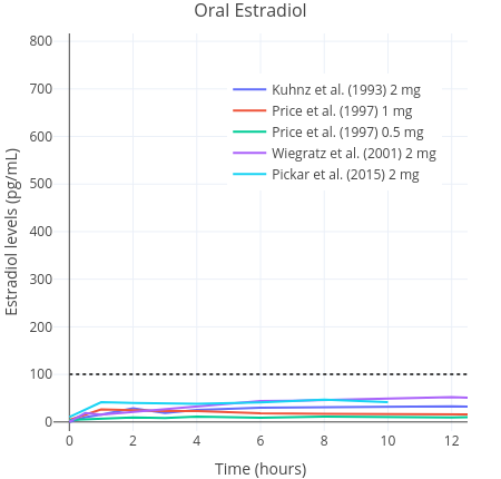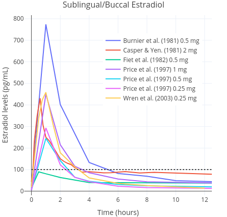 Because accidental swallowing of some of the estradiol seems probable, the sublingual route is, most likely, actually a combination of sublingual and oral delivery of estradiol (Lobo, 1987; Kuhl, 2005). A small pharamcokinetics study of transfeminine people reported that a single 1 mg dose of sublingual estradiol caused an average rise in the level of estradiol up to an average of 144 pg/mL (529 pmol/L) within one to two hours of administration. In contrast, a peak concentration of just 35 pg/mL (128 pmol/L) was found with the same dose of 1 mg administered orally (Doll et al., 2022). Thereafter, estradiol levels decreased rapidly. In another study, it was found that mean estradiol levels measured at any given point were 613 pmol/L (167 pg/mL) on sublingual estradiol (Kariyawasam et al., 2025). In this study, a wide range of doses were used and hence it is not possible to ascertain much about dose-specific peak concentrations. Similar findings have been reported in other studies of postmenopausal women, although a wide range of peak concentrations have been observed (Burnier et al., 1981; Price et al., 1997; Wren et al., 2003). Estradiol levels are found to rapidly rise on the order of about five to ten times that of the peak of oral estradiol, then rapidly decline, with an elimination half-life of only a few hours (Kuhl, 2005). Sublingual estradiol is somewhat analogous in this respect to intravenously administered estradiol, which also shows a rapid increase in estradiol levels and a very short elimination half-life (Kuhnz, Gansau, & Mahler, 1993). Another route of administration that is similar in this regard is intranasal administration (Devissaguet et al., 1999). Owing to the short half-life elimination of sublingual estradiol, it does not achieve as stable concentrations as other formulations do. This is a marked difference to other routes, such as oral estradiol, that produce much more stable hormone levels and that do not fluctuate as much over the course of the day. All these differences by themselves do not necessarily mean that sublingual estradiol is superior or inferior to oral estradiol (Safer, 2022; Sarvaideo, Doll, & Tangpricha, 2022). Nevertheless, they should be kept in mind when considering findings from relevant studies.