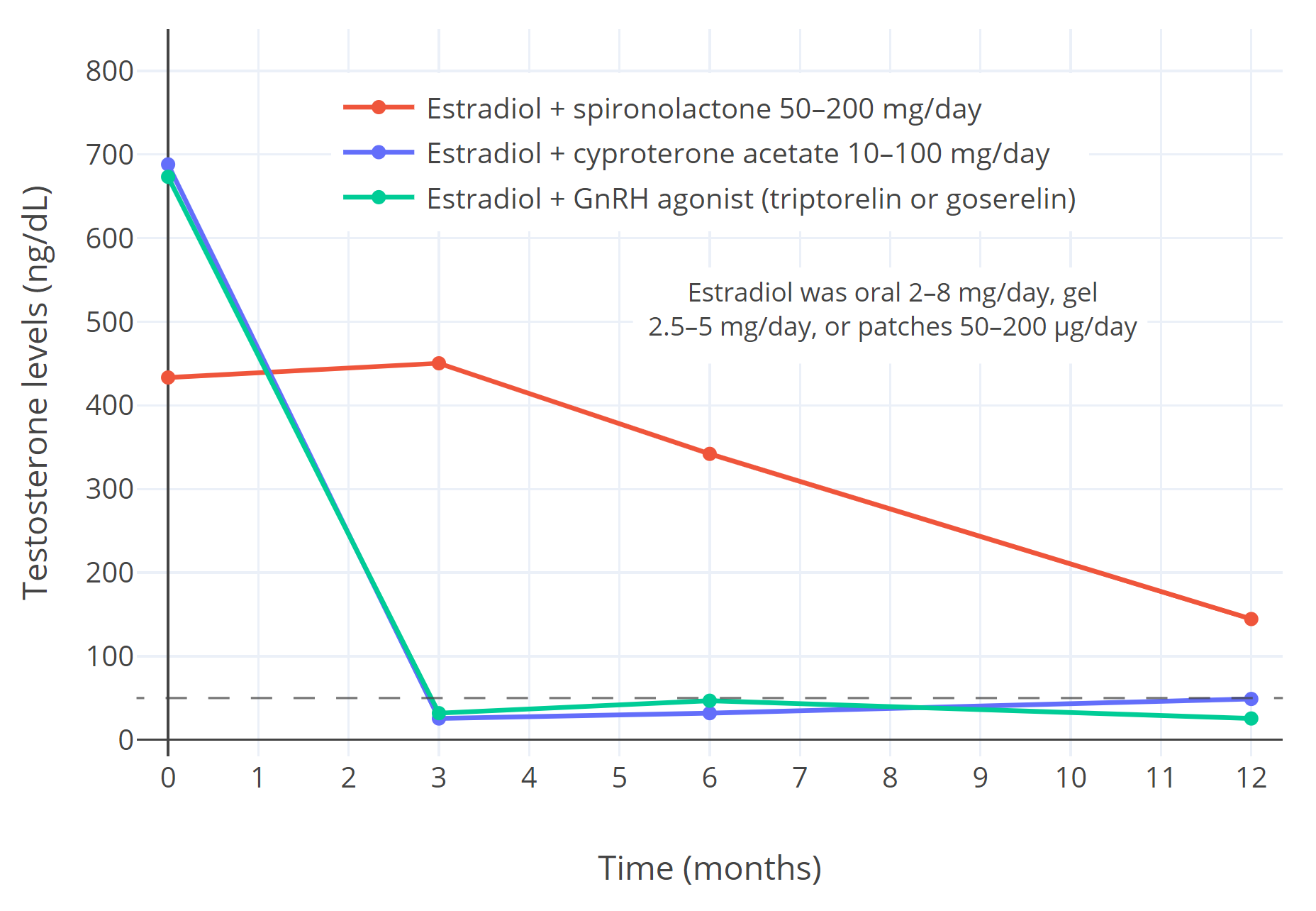 Estradiol dose-dependently suppresses testosterone levels in people with testes. Physiological and guideline-based levels of estradiol (<200 pg/mL or <734 pmol/L) are often not sufficient to suppress testosterone levels into the female range in transfeminine people who have not had their gonads removed (e.g., Liang et al., 2018; Krishnamurthy et al., 2023; Slack et al., 2023). As a result, estradiol is generally used in combination with an antiandrogen or progestogen in transfeminine hormone therapy (Hembree et al., 2017; Coleman et al., 2022; Rose et al., 2023). This results in partial suppression of testosterone levels by estradiol and further suppression or blockade of the remaining testosterone by the antiandrogen or progestogen. While combination therapy can be effective in fully suppressing or blocking testosterone (e.g., Aly, 2019; Aly, 2020), testosterone suppression can also still remain incomplete with antiandrogens and progestogens in certain forms (e.g., Aly, 2018; Jain, Kwan, & Forcier, 2019). In contrast to physiological estradiol levels, supraphysiological levels of estradiol are able to consistently and fully suppress testosterone levels into the normal female range with estradiol alone in transfeminine people (e.g., Gooren et al., 1984 [Graph]; Igo & Visram, 2021; Herndon et al., 2023 [Discussion]). This alternative approach, often referred to as high-dose estradiol monotherapy, has the advantage of avoiding the side effects, risks, and costs of antiandrogens and progestogens. However, it has the disadvantage of exposure to supraphysiological estradiol levels that are above those recommended by guidelines and that may have greater health risks. Physiological estradiol doses and combination therapy are more often used in transfeminine people treated by clinicians, whereas high-dose estradiol monotherapy is more frequently encountered in transfeminine people on DIY hormone therapy.