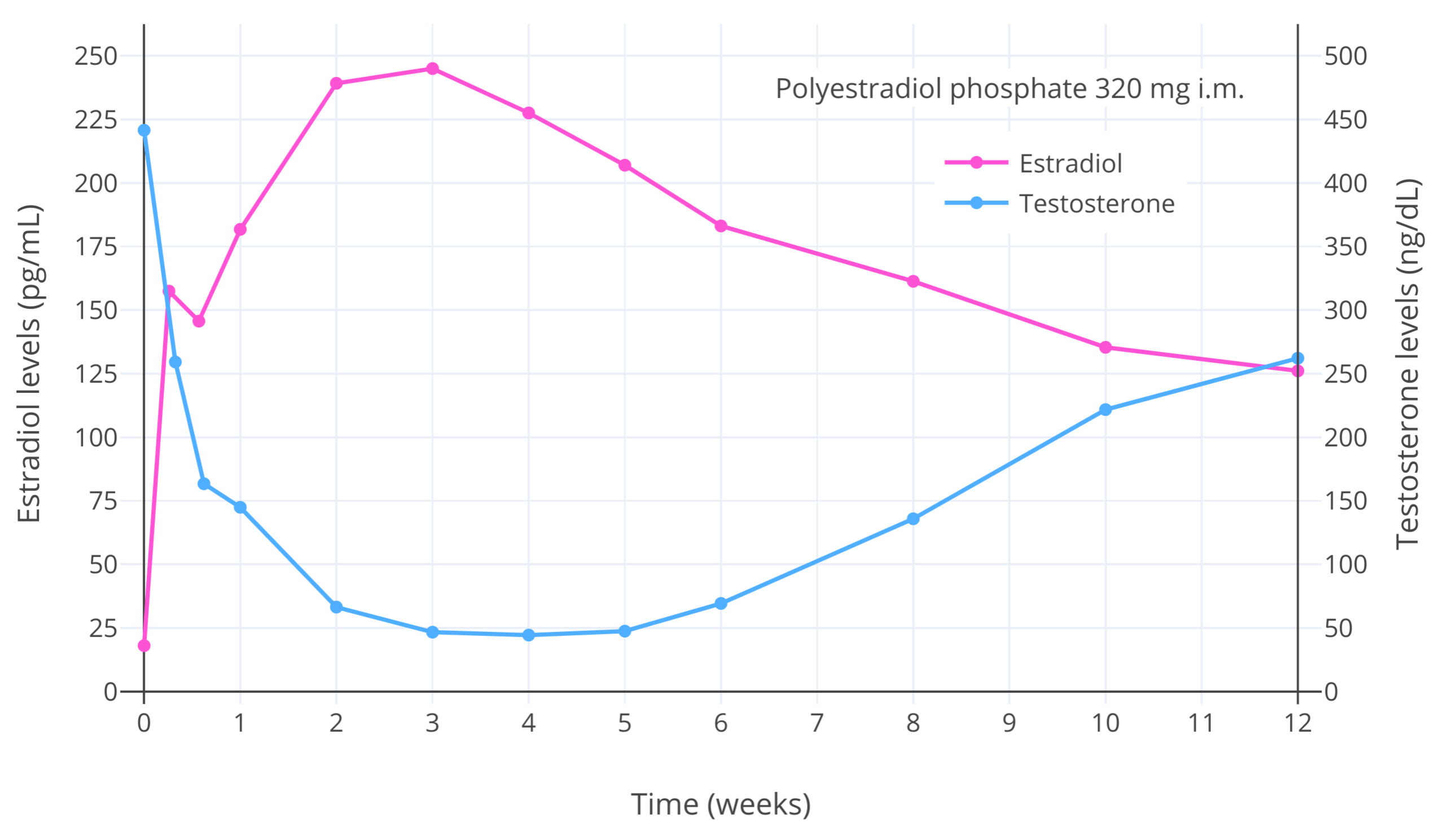 | Figure 2: Estradiol and testosterone levels after a single injection of 320 mg polyestradiol phosphate (PEP) (a long-acting prodrug of estradiol) in men with prostate cancer (Stege et al., 1996). The maximal decrease in testosterone levels occurred with estradiol levels of greater than 200 pg/mL (734 pmol/L) and was about 90% (to roughly 50 ng/dL [1.7 nmol/L]). This figure demonstrates the ability of estradiol to concentration-dependently suppress gonadal testosterone production and circulating testosterone levels in people with testes. |